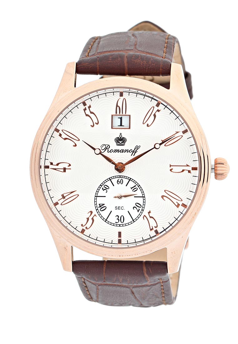 Часы Romanoff - это сочетание стильного дизайна и высокого качества. Модель с японским кварцевым механизмом Citizen. Функции: центральные часовая и минутная стрелки, боковая секундная стрелка в дополнительном окне, календарь чисел месяцев. Изделие с противоударным устройством. Белый гильошированный циферблат с арабскими цифрами. Корпус из гипоаллрегенной нержавеющей стали, позолота 3 мкр красным золотом. Размеры корпуса: 42x10 мм. Минеральное стекло устойчиво к царапинам и другим внешним воздействиям. Ремень из натуральной кожи с тиснением 'под рептилию' дополнен классической позолоченной пряжкой. Размеры: 22 мм. Влагозащита: 3 АТМ.
